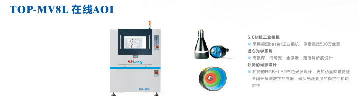 TOP-MV8L在線型AOI 采用德國(guó)Basler工業(yè)相機(jī),像素高達(dá)500萬(wàn)像素。高景深,低畸變,全像素,定倍解析設(shè)計(jì)。