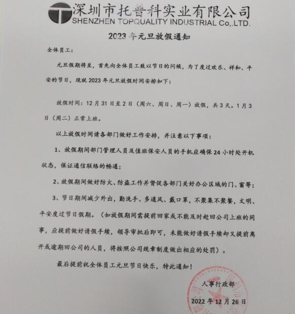 深圳托普科實(shí)業(yè)2023年元旦放假公告