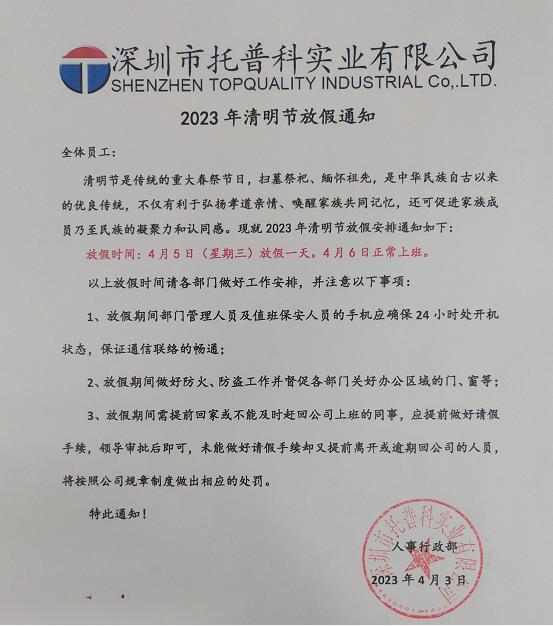深圳托普科實業(yè)2023年清明節(jié)放假通知