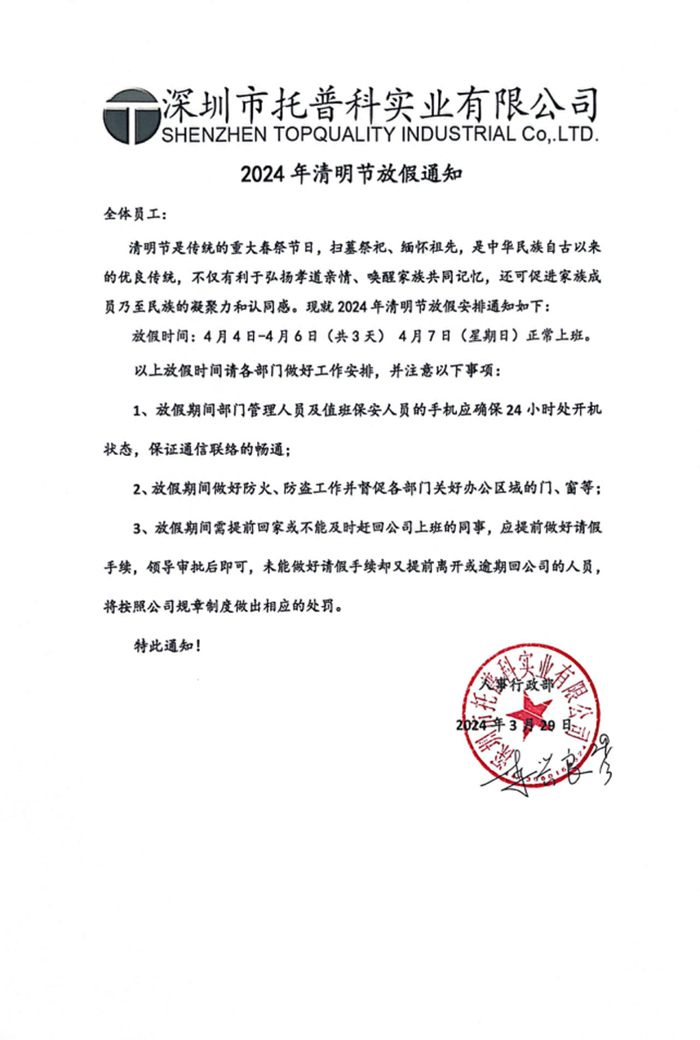 清明節(jié)放假時間:根據(jù)公司實際情況,我公司清明放假時間為2024年4月4日--2024年4月6日(周四、周五、周六)共3天,2024年4月7日(周日)正常上班。